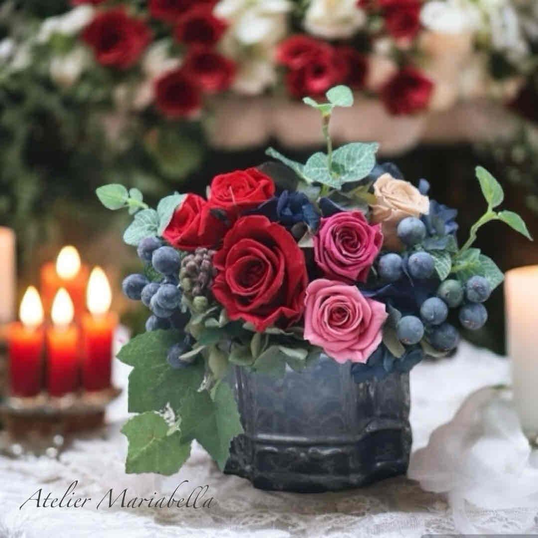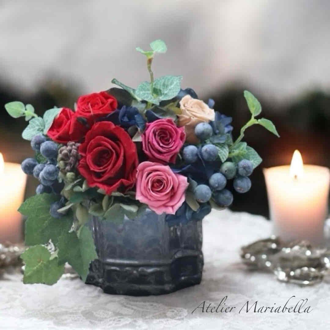 贅沢に飾られた6輪のローズには落着きある暗めのベリーを添え
